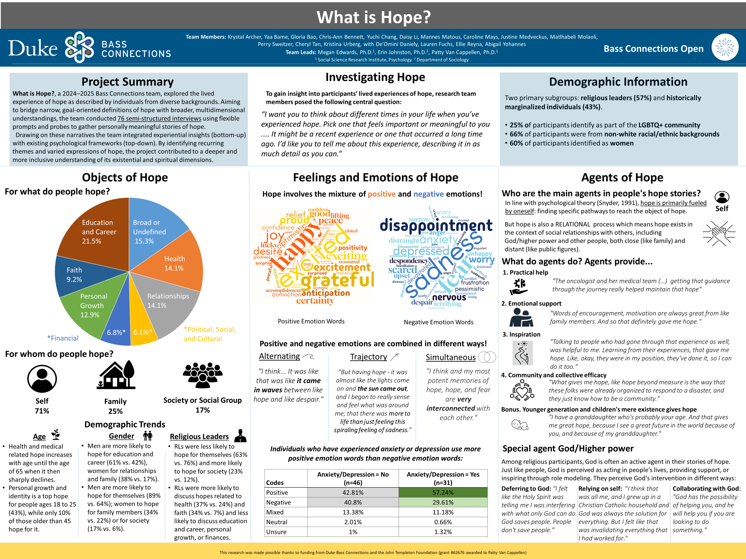 This team engaged with the lived experience of hope as reported by practitioners and community members, including people of faith. Team members conducted semi-structured interviews to gather 76 personal stories of hope. This data repository contains rich qualitative data on experiences of hope from a diverse set of people representing different religious, cultural, and socioeconomic backgrounds. By identifying common themes and elements of these hope stories, the Bass Connections project team was able to provide a broadened understanding of what the lived experience of hope looks like for everyday people.