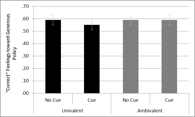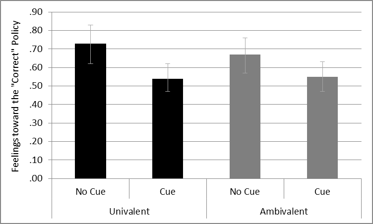This y-axis in the figure represents relative support for the ideologically “correct” policy (i.e., consistent with partisanship; coded 0-1) as a function of the party cues treatment condition and measured partisan ambivalence. It shows that the presence of the counter-stereotypical partisan cue decreases relative support for the ideologically consistent policy, but only among univalent citizens. There were no significant differences among the other three conditions.
