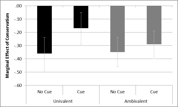 An alternative model specification to the one examined in the book utilizes the difference in feelings between the two policies. The results of this analysis are shown in the figure below. It reaches the same substantive conclusion as the analysis utilizing the dichotomous choice measure, but with stronger results, and no main effect of ambivalence (see Figure 4.2 in the book).