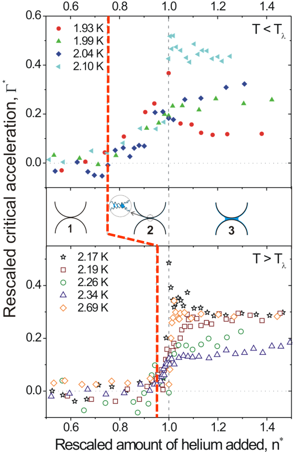 For wetting by helium I, the critical acceleration for fluidization shows a steep increase close to the saturation of the vapor pressure in the sample cell. While for helium II wetting, the critical acceleration starts to increase at about 75% saturation (see the red dash line), indicating that capillary bridges are enhanced by the superflow of unsaturated helium film.
