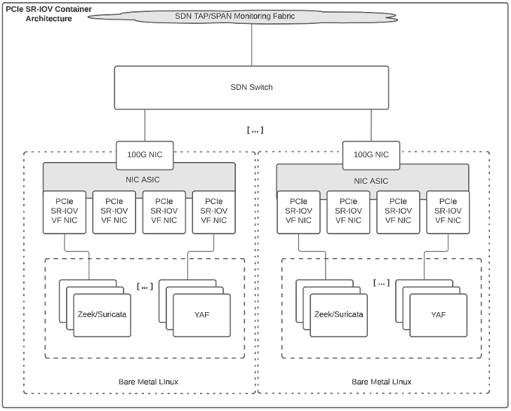 The SDN data plane and network appliance used as the MISTRAL sensor node build upon prior NSF-funded work as a part of Archipelago (OAC-1925550). As a part of this deployment, data ingested by the SDN data plane is symmetrically hashed so that both sides of a given conversation appear in the same output stream. A unique VLAN tag is then added to these output streams for delivery to sensor appliances that can be customized with personas for different use cases as described further here: https://sites.duke.edu/archipelago/files/2023/01/archipelago-final-appliance-evolution-v1.pdf. In this deployment scenario, a 100G Mellanox ConnectX-5 NIC is used with PCIe SR-IOV virtual functions enabled to place traffic associated with each unique VLAN tag into a dedicated virtual function within the NIC as illustrated in Fig. 2.