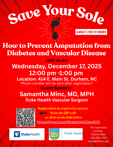 Vascular surgeon Samantha Minc, MD, MPH, recently served as the guest speaker for the Durham County, NC Department of Public Health’s What’s the 411 Series – an ongoing educational program that offers free workshops (in person or virtual) about managing diabetes and related issues.