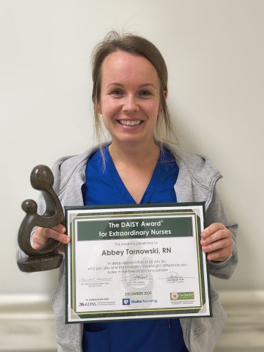 Congratulations to Abbey Tarnowski, RN, of the Duke University Hospital CVSSU/EP Lab! She was surprised with a DAISY Award on Tuesday, Dec. 16, 2025.